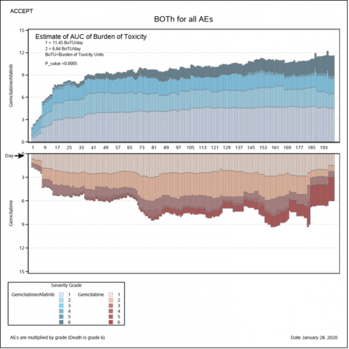 The phase II ACCEPT trial included 119 patients (pts) with histologically proven pancreatic cancer without any previous systemic treatment for metastatic disease. Pts were randomized in a 2:1 ratio to receive either afatinib 40mg orally once daily + gemcitabine (1000mg/m iv weekly for three weeks followed by one week of rest, repeated every four weeks) or gemcitabine alone. The addition of afatinib did not lead to improved efficacy (7.3 vs. 7.4 months, HR 1.06, p = 0.80; data previously shown). The traditional analysis of adverse events was not able to reveal the actual patient´s burden in each of the treatment arms.